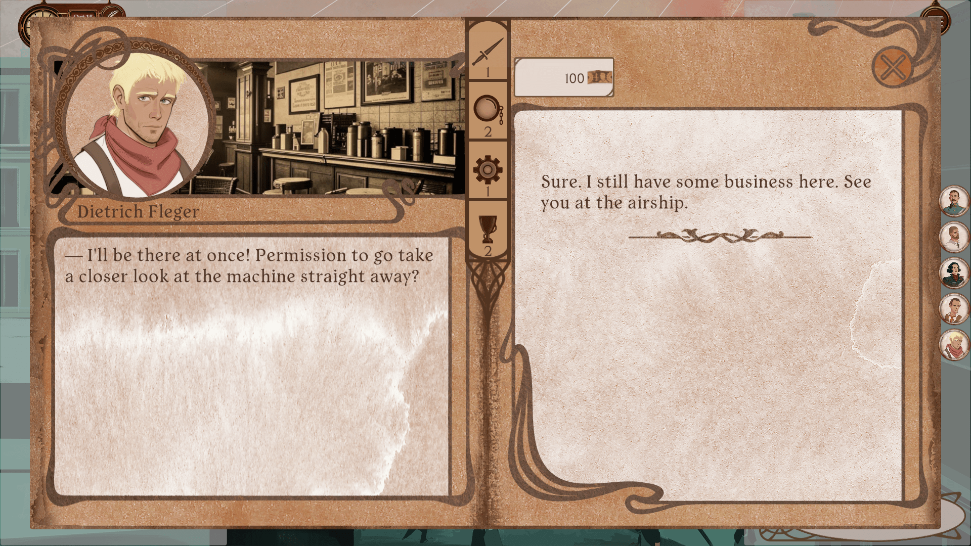 Сейчас мы работаем над вертикальным срезом всех механик игры: в демо-версии уже реализованы симулятор дирижабля, сбор ресурсов и платформенный режим с торговлей и текстовыми квестами на основе оригинальной ролевой системы. В ближайших планах добавить наём команды, воздушные бои против дирижаблей и летающих животных, а также улучшение дирижабля. Разрабатывается сюжет основного и побочных квестов.
